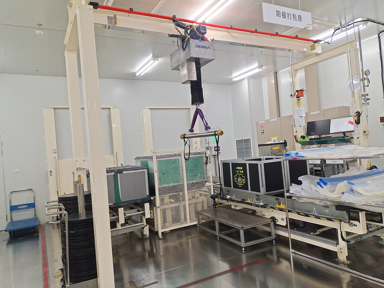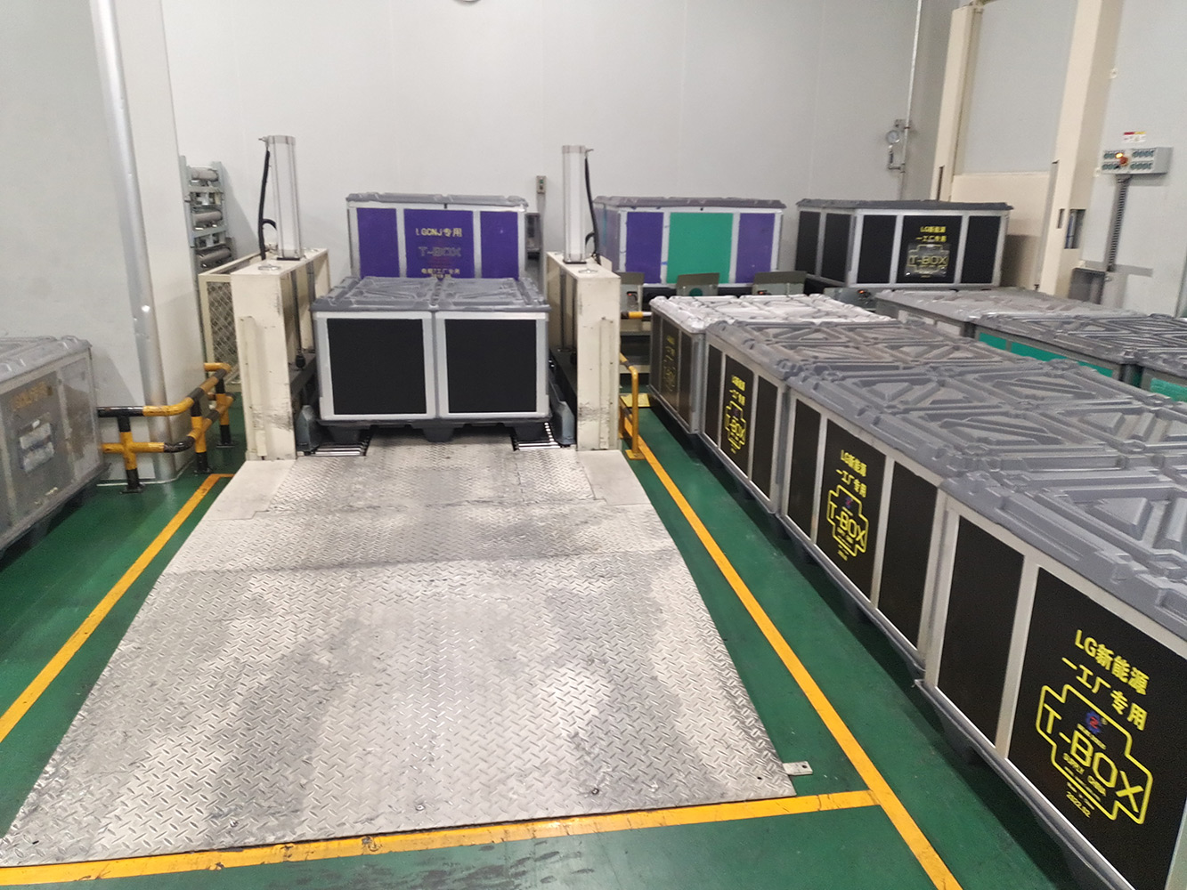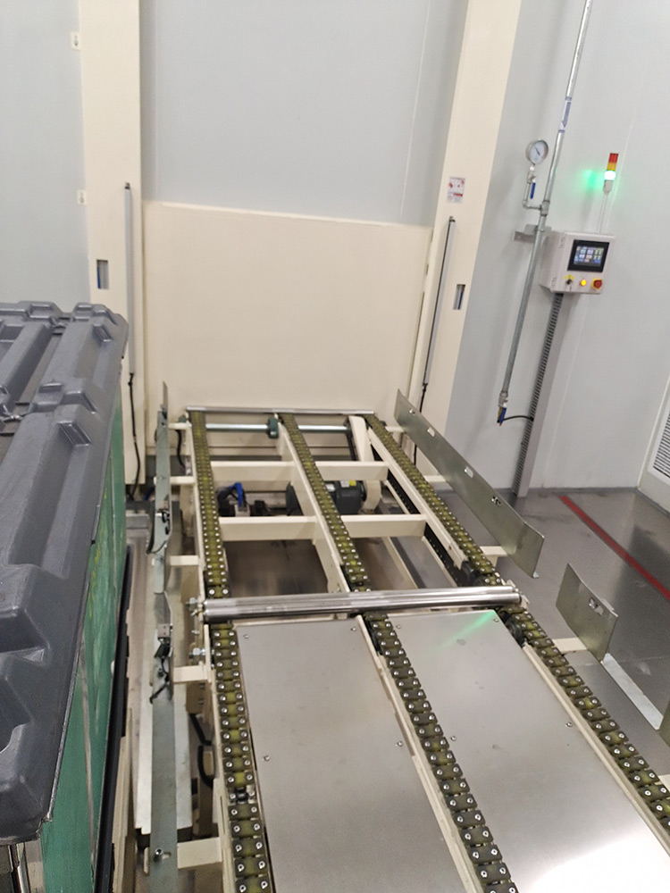 该系统将空T-BOX送入室内不同装包区域,装包完T-BOX通过物流完成自动化打包。该系统包含升降物流线、旋转物流线、RGV有轨小车、牙叉移栽设备、室内洁净航吊系统、自动打包机、360度旋转物流线及配套的安全防护设备。