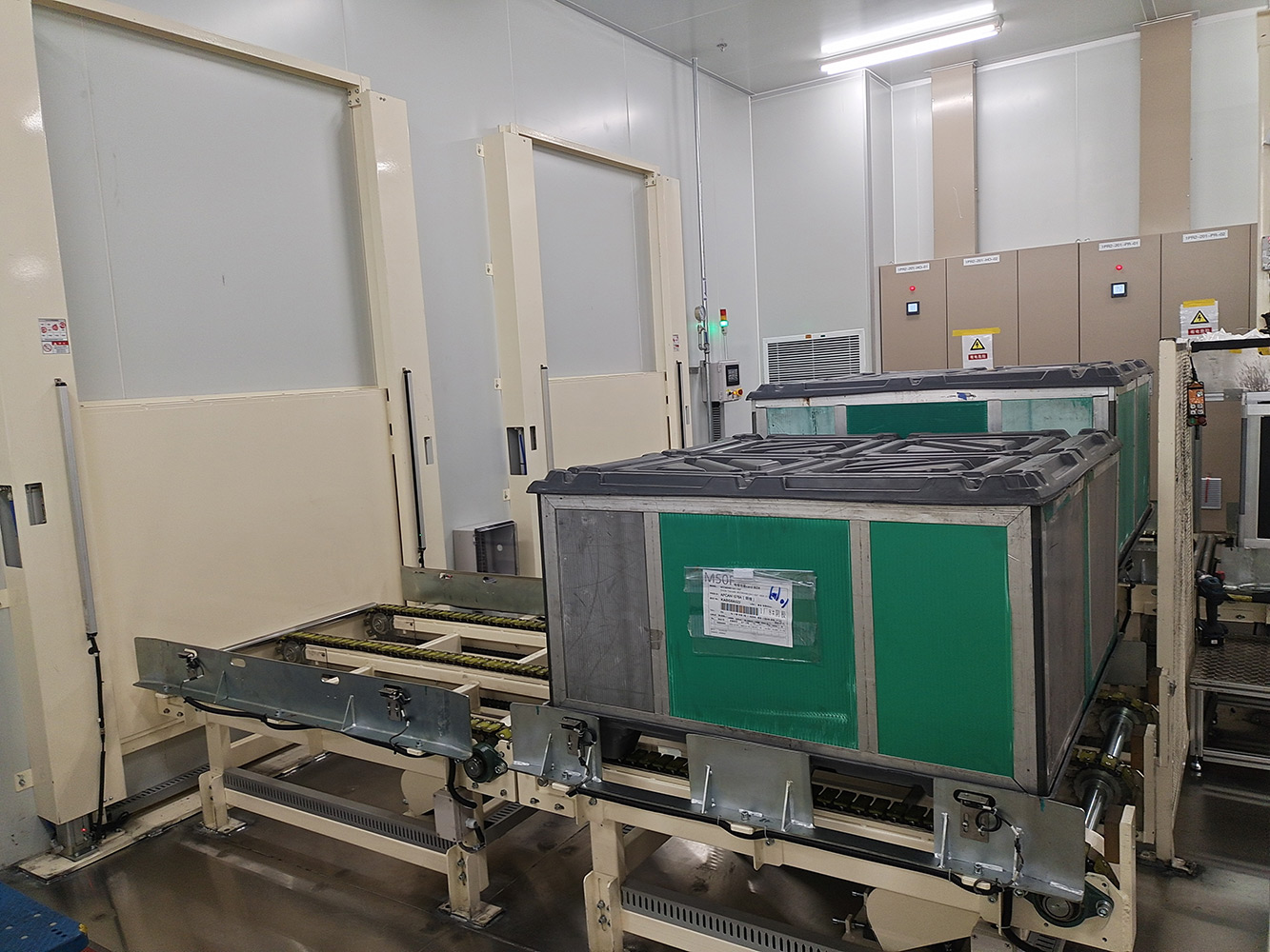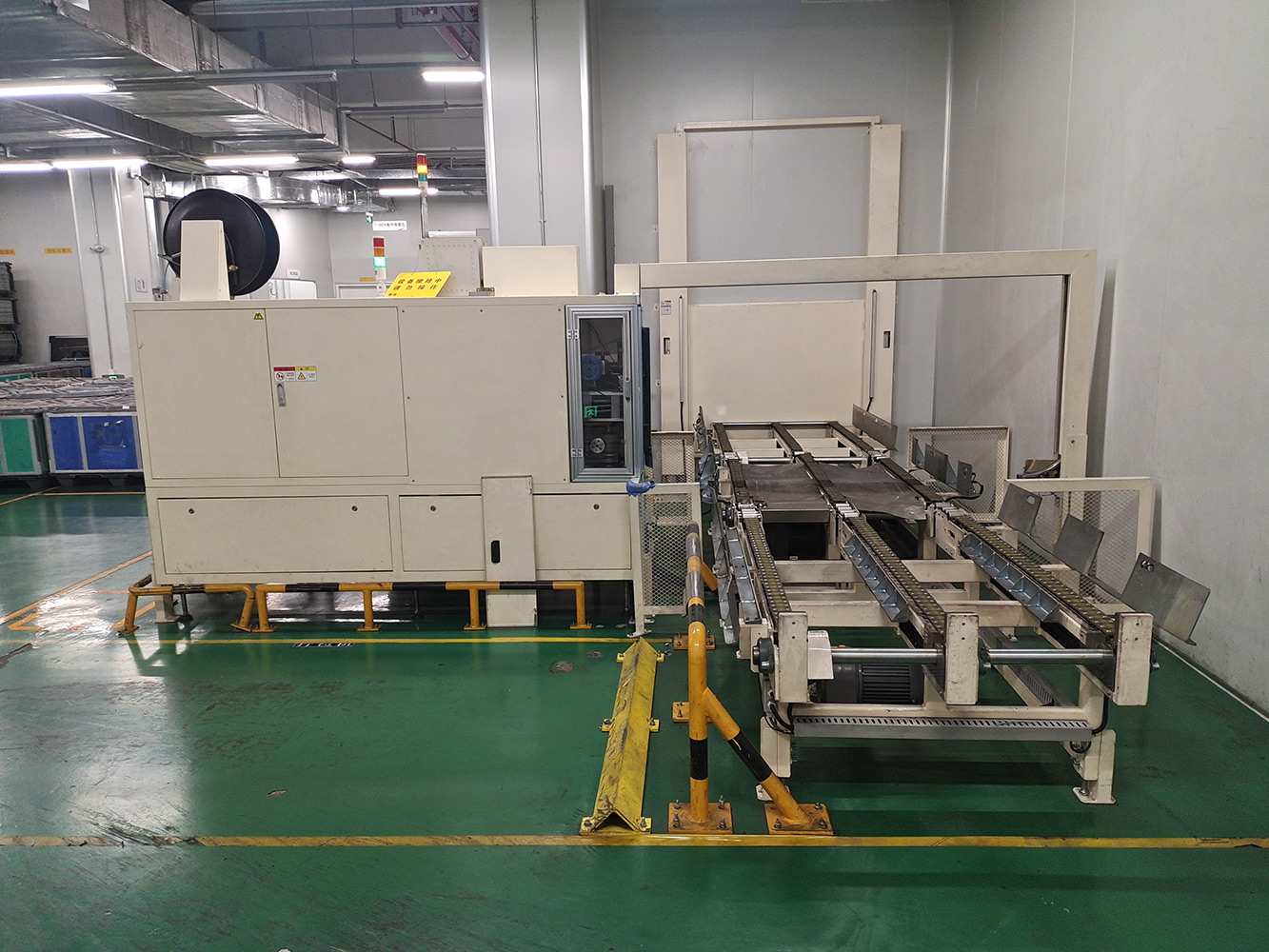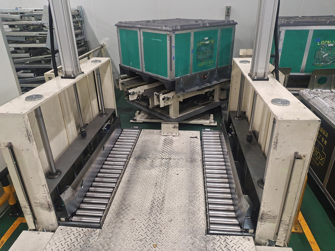 该系统将空T-BOX送入室内不同装包区域,装包完T-BOX通过物流完成自动化打包。该系统包含升降物流线、旋转物流线、RGV有轨小车、牙叉移栽设备、室内洁净航吊系统、自动打包机、360度旋转物流线及配套的安全防护设备。